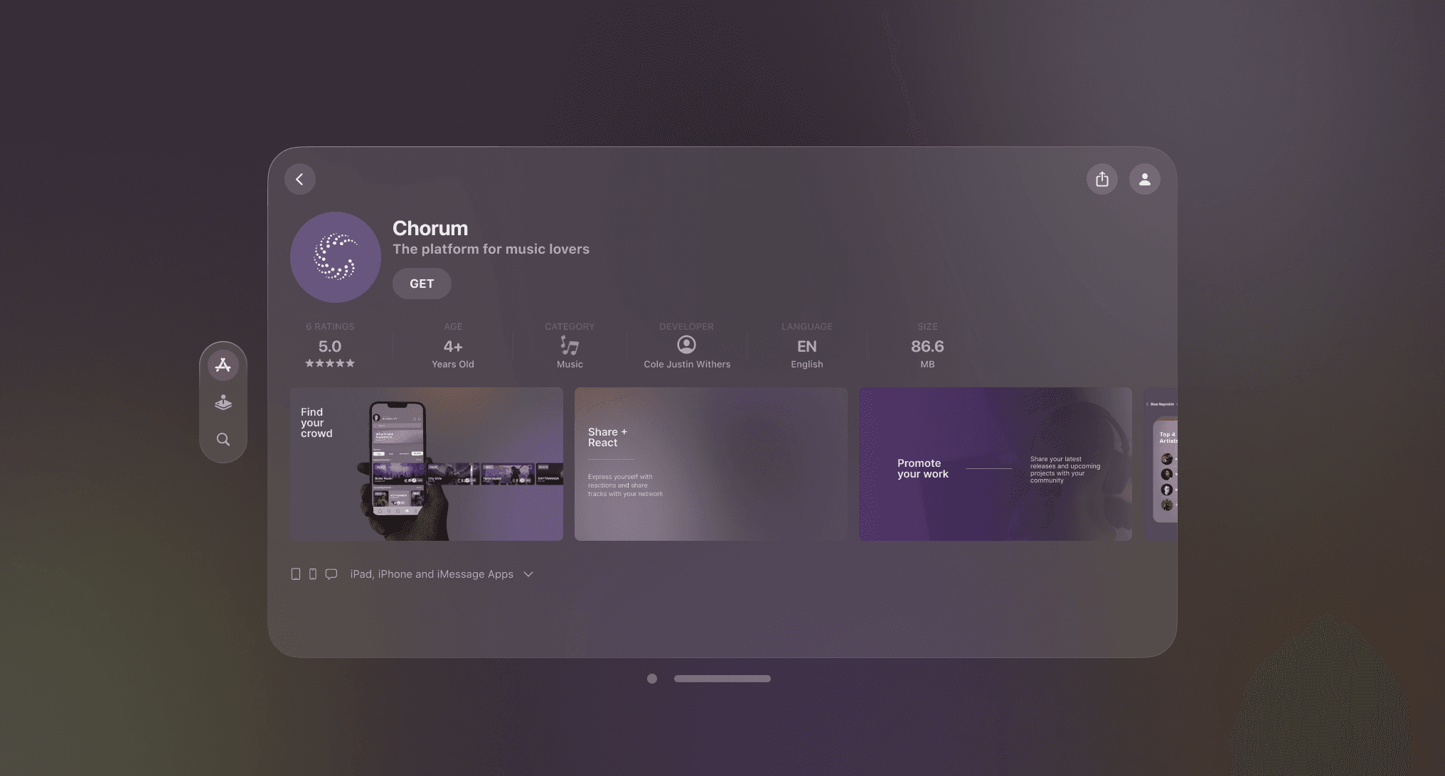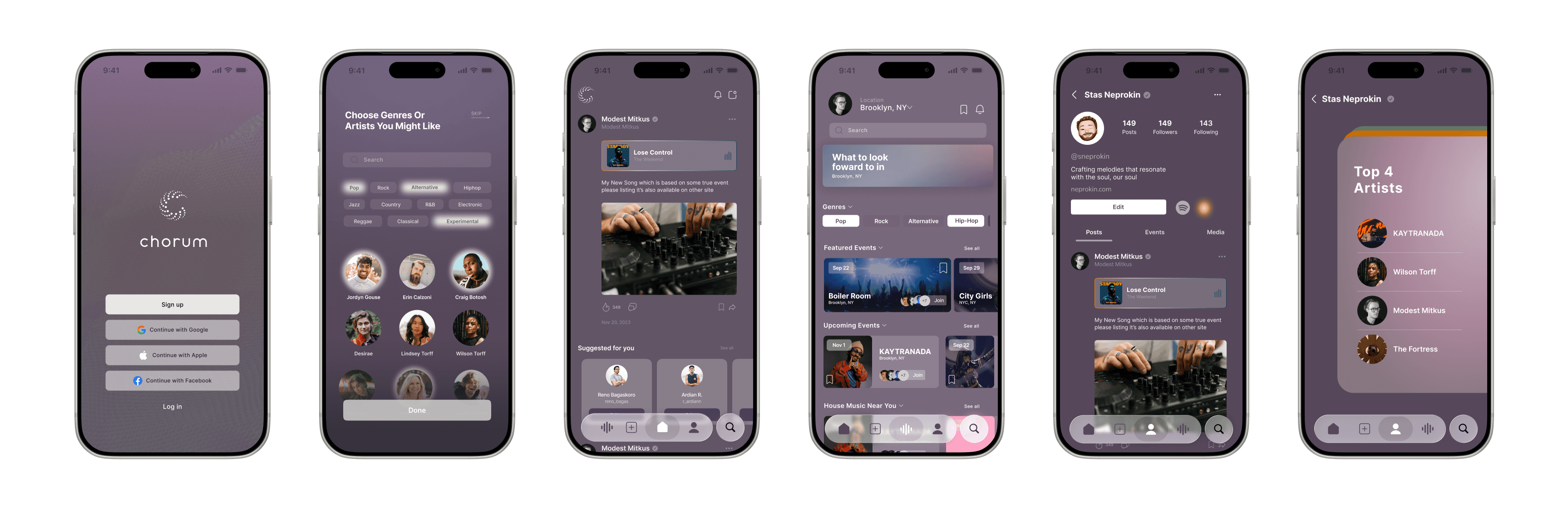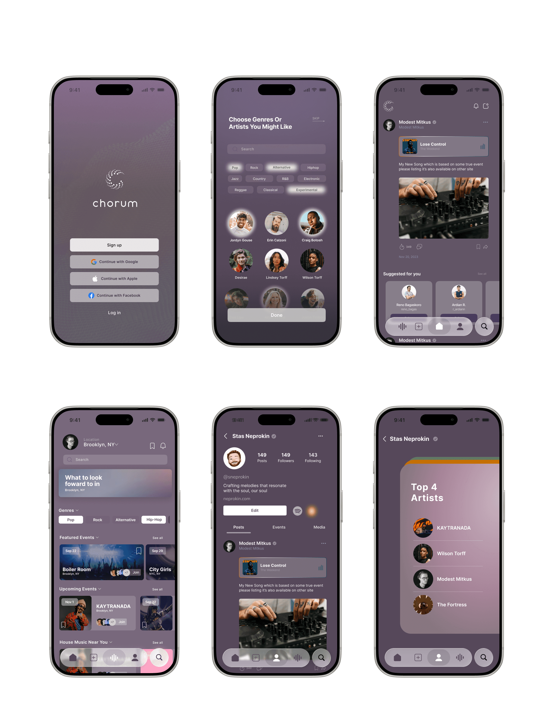 The visual language reflects this philosophy: gradients that move like sound waves, blurred layers that suggest depth, and minimal, purposeful typography that lets the music take center stage. From listeners exploring new tracks to artists sharing work with real communities, Chorum’s design is rooted in experience over distraction.